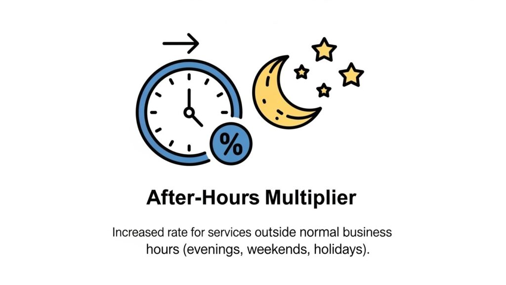 - After-hours multiplier: Night, weekend, and holiday rates are often 1.5x–2.5x the standard daytime labor rate.