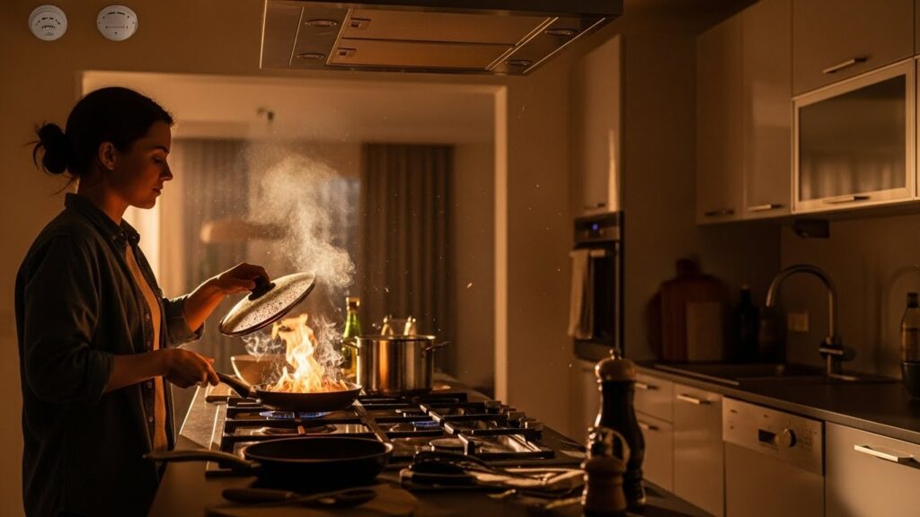 She turned and saw smoke rising—quick, thin, and then thicker. Grease had spilled and caught, licking up the pan and kissing the cabinets with heat. Her heart raced. For a split second, panic took the wheel.